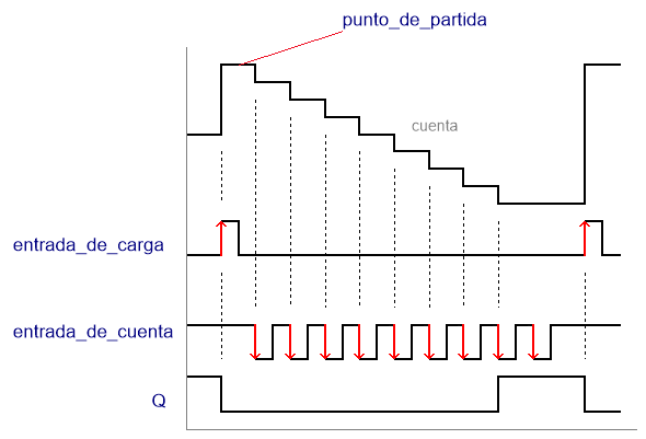 La operación contador decreciente (CTD) empieza a contar hacia atrás a partir del valor punto_de_partida cuando se produce un flanco negativo en la entrada_de_cuenta. Si el valor actual de cuenta es igual a 0, se activa el bit de salida. El contador desactiva el bit de salida y carga el valor actual con el valor de punto_de_partida cuando se activa la entrada_de_carga. El contador se detiene al alcanzar el valor cero y el bit de salida se activa. El estado del bit de salida (Q) se refleja en el acumulador después de haber ejecutado la instrucción. La variable contador tiene el estado de cuenta. Puede leerse o usarse en comparaciones. Es necesario ejecutar periódicamente la instrucción para detectar los cambios en entrada_de_cuenta. |