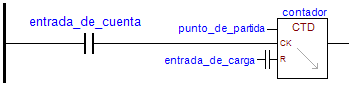 LD entrada_de_cuenta ;Se cuentan las transiciones de 1 -> 0 LD entrada_de_carga ;Re-inicia el contador CTD contador, punto_de_partida ST salida contador ;La salida del contador (0 o 1) se refleja en el acumulador