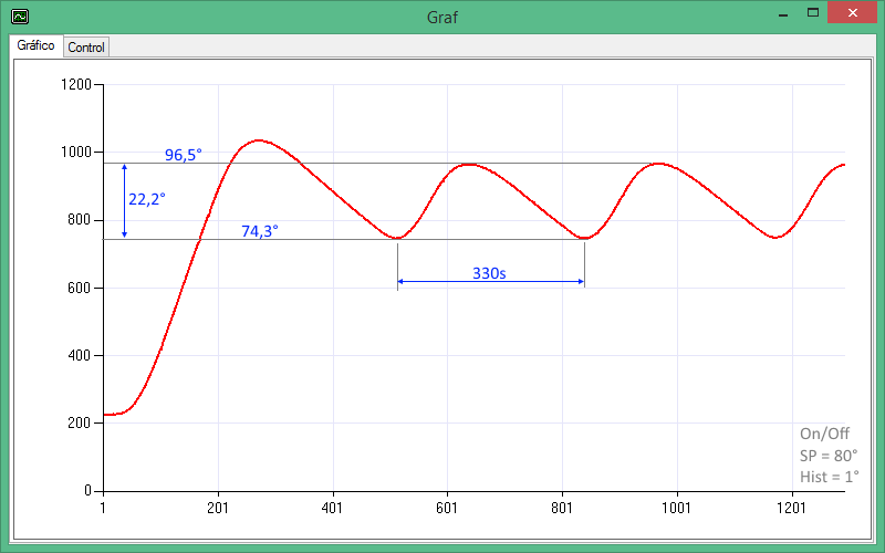 La subrutina que tiene la instrucción PID se ejecuta una vez cada 10 segundos. Entonces para que Ti tenga los 330 segundos correspondientes a las mediciones en la prueba, se le asigna 33 (33 * 10 = 330). El valor de salida del PID es convertido a modulación de ancho de pulso usando un oscilador variable (OSCV).