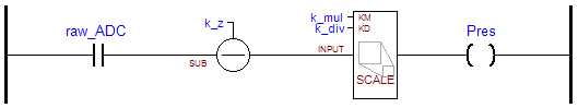 Este es el esquema para escalar la medición de un transmisor 4-20mA conectado a una entrada analógica. Primero se lee dicha entrada (raw_ADC), luego se le resta el corrimiento fijo de los 4mA (k_z), se escala y el resultado es depositado en una variable (Pres). Con tres argumentos A partir del CP121 2.70, CP122 2.20, CP123 2.30, CP125 1.10, CP127 1.00, CP128 1.00, CP220 1.00 varias instrucciones de dos argumentos son reemplazadas por tres argumentos. El comportamiento de cada uno resulta en la siguiente forma: SCALE arg1, arg2, arg3 equivale a arg1 = arg1 * arg2 / arg3 El primer argumento (arg1) debe ser de 32bit (solo CP12x) mientras que el resto (arg2 y arg3) pueden combinarse 16bit, 32bit y constantes. Solo para el tipo real todos deben ser del mismo tipo. Ver tipo de dato. La ejecución es condicional. En Ladder, por causa de la representación gráfica, el arg1 al final en vez de al principio. Esto ocurre con ADD, DIV, FAVG, FIFO, FILL, MOD, MUL, SCALE, STDVT y SUB.